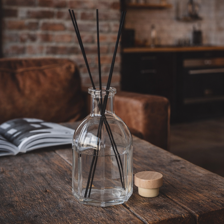 Большой стеклянный флакон объёмом 1250 мл — идеальная основа для интерьерного диффузора, который становится не просто источником аромата, а частью пространства.