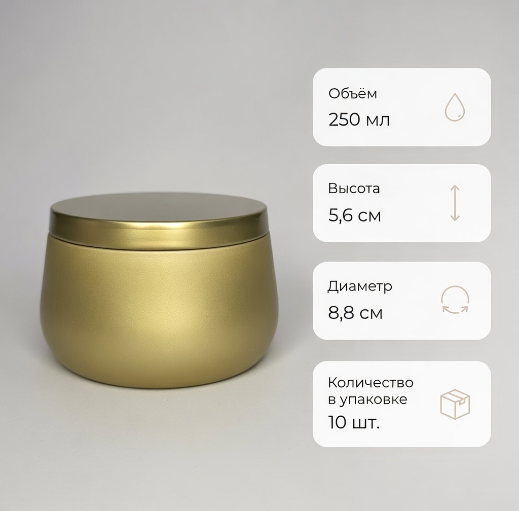 10 золотистых металлически подсвечников 250 мл с крышками, высота 5,6 см, диаметр 8,8 см.